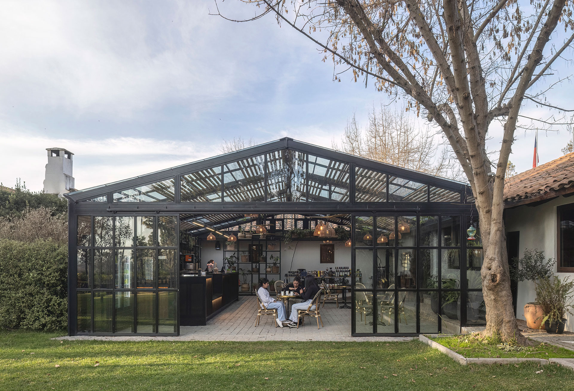 Para la cafetería, la intervención arquitectónica se desarrolla sobre la terraza de adoquines que funciona como patio central entre las construcciones existentes. El principal desafío consistió en dialogar respetuosamente con la arquitectura original de la viña, al mismo tiempo que se incorporaba un nuevo servicio. La propuesta materializa un volumen acristalado a dos aguas y abierto hacia los jardines diseñados por Monsieur George Henri Dubuois a finales del siglo XIX.