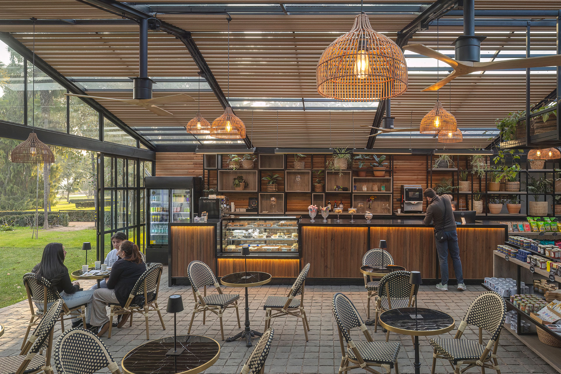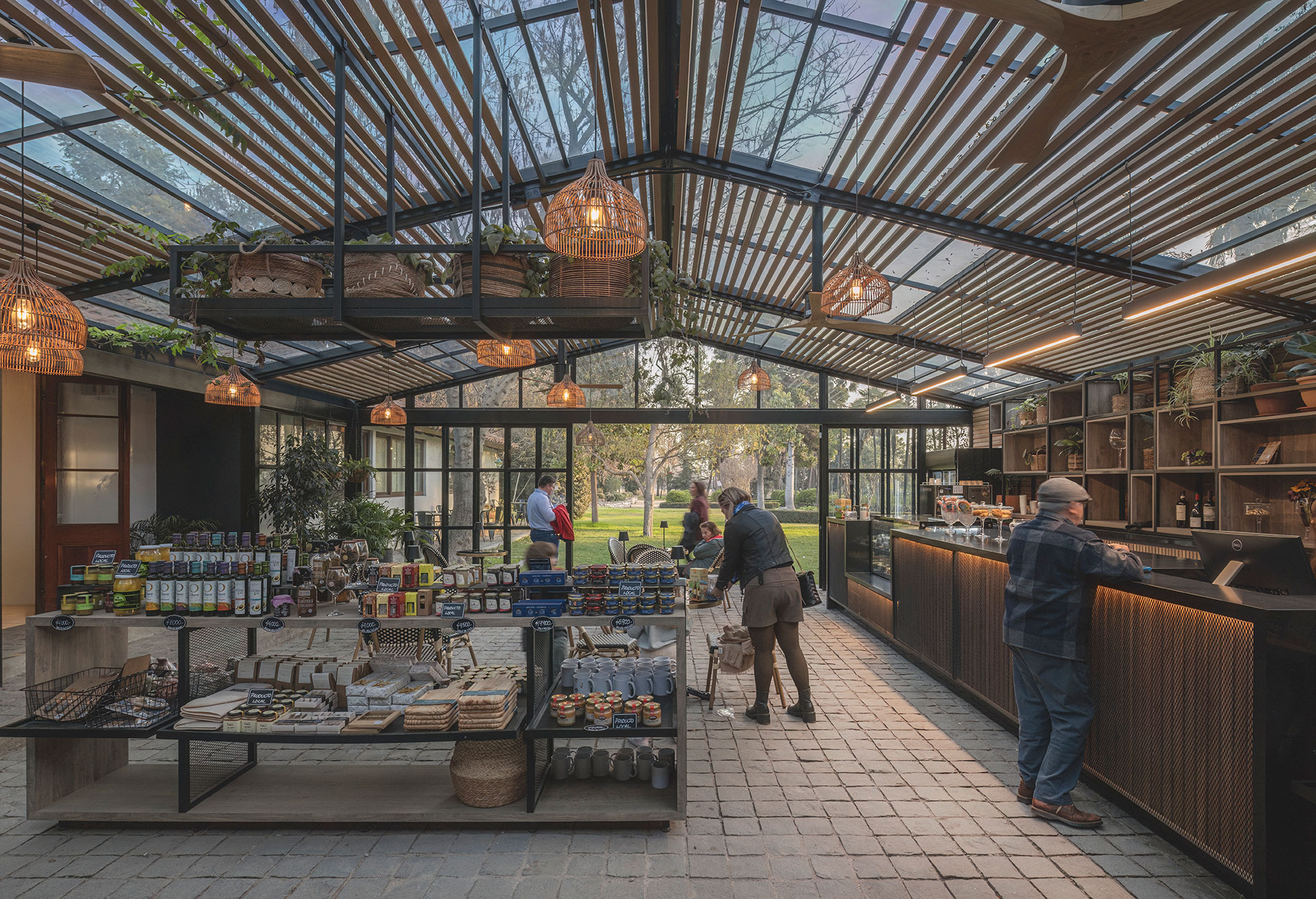 En cuanto al interiorismo, se diseñó una barra lateral robusta que integra todo el equipamiento de cafetería, permitiendo que el resto del espacio quede disponible para mesas y sillas. El mobiliario fue pensado para incorporar vegetación natural y exhibir productos de la viña, invitando a las personas a hacer una pausa, contemplar el paisaje y disfrutar de café, repostería o una copa de vino.